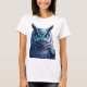 Vibrant Colour Palette: Rich shades of blue, purple, and indigo pop against the clean white tee, with striking turquoise eyes.