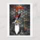Mystical Fire Wizard Magician Holding Magic Wand with Stars and Fire. Faux Silk Cape with fancy silver fish and dragon and Pointed Hat with faux red metallic standing Lion. Completed with Geometric Pattern Background.
