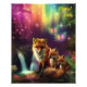 A beautiful fantasy design on a mystical forest with a waterfall and northern lights. In the foreground is a fox and her cubs with butterflies and fireflies to complete the scene. The words "Mystical Forest" can be edited by you to a name or whatever you want to make it more personal for you. Generative content.