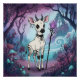 A magical horned hybrid stands in a glowing forest, with jewelry and a crystal-topped staff. Surrounded by mushrooms, spider webs, and eerie trees, it watches over a misty path leading to gothic ruins. This dreamlike illustration blends fantasy, mystery, and magical charm. AI