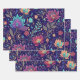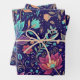 A richly detailed and enchanting seamless pattern set against a deep midnight blue background. It features stylized, vibrant lotus and fantasy flowers in striking, bright colors like magenta, turquoise, and coral, accented by whimsical swirling vines and golden leaves. Scattered elements of small stars, moons, and decorative dots add a magical, celestial touch. This intricate, bohemian, and luxurious design is perfect for wrapping gifts for birthdays, spiritual occasions, or anyone who loves intricate patterns and deep, jewel tones.