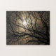 This gorgeous puzzle presents a mystical nighttime sky. The air is permeated with mist. The full moon shining through the trees lights up the misty clouds in shades of gold, yellow orange, white and brown and forms an interesting abstract pattern.