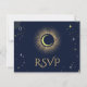 Celestial mystical personalised wedding response card featuring galaxy milky way midnight sky with star dust, crescent moon and other astrological symbols in navy blue and golden colours. This card is easily editable. If you need help with the customisation of this card or you need more matching products for this collection kindly message me via Zazzle.