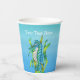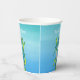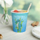 These paper cups are various shades of blues with a mystical ocean creature or seahorse that is aqua blue and white with its tail wrapped in green seaweed on the front and back. Customise your text with the templates on the front and back.