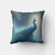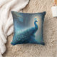 The image features a vibrantly coloured peacock with an expansive tail full of eyespots situated at the entrance of a forest pathway. The peacock is rendered in shades of blue and green with hints of yellow around the eyespots. A soft glow emanates from the bird, adding to the mystical atmosphere. The surrounding environment is a dense forest with mist hovering above the ground and light filtering through the trees. An ornate stone archway frames the scene behind the peacock, suggesting an entrance to an enchanted place.