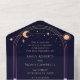 Mystical Rainbow Sun Star Moon Astronomy Space All In One Wedding Invitations features silver sun, moon and stars with a rainbow coloured frame on a dark blue background. Inside is your custom wedding invitation information. Below is the removable RSVP card with three meal choice options for you guests to remove and return. Personalise by editing the text in the text boxes. For additional number of meal choice options with this design please visit our store and view our collection. Meal type can be changed by simply editing the text in the personalise this design section. Designed for you by ©Evco Studio www.zazzle.com/store/evcostudio