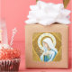 This design is inspired by a beautiful painted and embroidered decal on a Roman Catholic vestment worn for masses of the Blessed Mother. She holds a stem of lilies in her hands, a bouquet of roses frame her, a halo crowns her head.