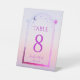 Mystical Sunset Pink Sun Moon Stars Wedding Table Numbers Pedestal Sign features a pink and purple sun, moon and stars frame on a pastel beach sunset background. Inside is your custom table number information. Designed for you by ©2022 Evco Studio www.zazzle.com/store/evcostudio