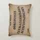 This throw pillow features a mystical spirit board design. The background is a rustic looking, old wood or parchment paper pattern. A vintage, gothic style frame borders the pillow. The alphabet and numbers are printed across the centre, with simple "yes" and "no" answers printed above. A "good bye" message is at the bottom.