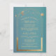 Mystical Teal Gold Sun Moon Stars Baby Shower Celestial Gender Reveal Baby Shower Invitations features a gold sun, moon and stars frame on a teal background with your menu details in the centre in modern calligraphy script. Inside is your custom baby shower and gender reveal invitation information. Personalise by editing the text in the text boxes. Designed for you by ©2022 Evco Studio www.zazzle.com/store/evcostudio