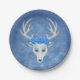 This paper plate is a misty mix of blue shades with a mystical white deer head with blue eyes, antlers, and wearing three pretty blue roses.