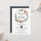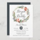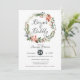 Modern Botanical inspired bridal shower invitation featuring watercolor wreath of winter flowers, poinsettia, berries and pine cones..
