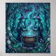 This mystical poster features two witches brewing a glowing potion in a moonlit enchanted forest, surrounded by swirling magic and luminous teal-blue light. Finished in a oil acrylic painterly style.
