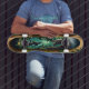 This skateboard design depicts a dramatic scene of a samurai facing a formidable yet majestic mythical creature, possibly a dragon or a tengu, in a dense forest. The scene captures the bravery and skill of the samurai, katana drawn, ready to confront the creature. The vibrant colour scheme highlights the contrast between the samurai's armour, the creature's features, and the lush greens of the forest, creating an atmospheric backdrop filled with mystique and danger.