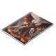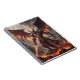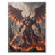 This captivating image features a powerful demonic figure standing in a fiery landscape. The figure boasts large, bat-like wings engulfed in flames and is clad in dark, spiked armour. Its glowing red eyes and menacing expression, complete with large, curved horns, add to its formidable presence. Holding a flaming sword in its right hand, the demon exudes power, with its chest glowing as if fuelled by an internal fire. The dramatic background of a stormy sky, lightning, and gothic-style buildings enhances the intense and epic atmosphere of the scene, making this artwork a striking depiction of a mythical creature in a moment of dominance.