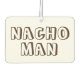 Air freshener features an original marker illustration of a tray of nachos topped with cheese, sour cream, and peppers, and NACHO MAN in a fun brown font.