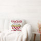 Throw pillow features an original marker illustration of a tray of nachos topped with cheese, sour cream, and peppers, and NACHO WOMAN in a fun red font.