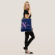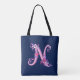 Pretty hand drawn N monogram name and meaning bag design. Ideal for a personalised gift for a girl who has a name beginning with N. This example reads Nadia Giver of hope, tender, athletic and well spoken or you can customise the text with your own name and meaning words if required. Background colour currently dark blue but you can also change this to your own choice of colour if required. Ideal as a special birthday or celebration gift. If you need help with your own personalised name please contact me. Capital letter N typographical hearts and flowers drawing and graphic conversion in shades of bright pink and purple © unique art text and design by Sarah Trett. www.sarahtrett.com for www.mylittleeden.com