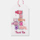 Fun gift tag features stacked bottles of nail polish in a variety of colours with customisable pink text. Perfect for salon giveaways and spa parties.