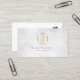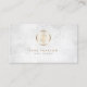 This elegant professional nail salon business card features an elegant marble texture background. A gold floral motif icon appears on the top half of the card. Your name and title appear in the lower middle section, below the gold monogram square. Perfect for professional, fashion, style, beauty, ladies, women, fine art, artistic, designer themes.
