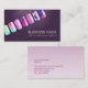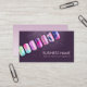 illustrated nail technician and manicurist card with original nail art, with designed nails on top of a dark background with flourished swirls.