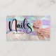 Modern sparkly Nail Technician business cards. Design features photo of nails, holographic background with sparkly glitter, typography script ''nails'' and a name on the front. Personalise further with your contact details on the back. Perfect for nail salon, nail technicians.