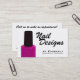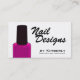 A successful business starts with amazing business cards! Are you a nail technician? These cards can be customised with your name and phone number! If you would like to change or add any other information on this card, such as the "Nail Designs" logo or your address press the "Customise It" button and change as needed. Design features a pink bottle of fingernail polish with a clean white background and room for your personal information.