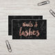 A modern, stylish nails and lashes, eyes makeup artist business card with modern hand lettering style brush typography in faux rose gold foil on a trendy and elegant black marble background.
