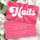 Trendy business cards featuring your name and the text "Nails" in a bold, retro script font on a pink sunburst background. Contact information on the back.