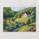 A gentle, dreamlike landscape stretches before you, painted in soft flowing hues of green, blue, orange, and purple. Trees with delicate leaves sway along the edges, their colors blending seamlessly into the surrounding bushes and rolling land. In the distance, a charming house nestles quietly among the trees.