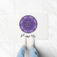 White door mat with a purple floral spiritual lotus flower mandala print and personalised Namaste text. Matching bath decor available at the ScriptoGraphic Design Store.