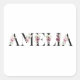 The name Amelia written in beautiful letters. Each letter is decorated with a bouquet of flowers. Colourful flowers for a woman.