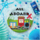 If it's a train theme birthday celebration you'll find these All Aboard Train birthday paper plates to be a perfect fit! Features a colourful train locomotive and car with railroad crossing sign, train tracks, blue sky, green grass and hills, text that reads All Aboard, and an area you can easily add the birthday boy or girl's name and age!