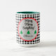 A classic black and white buffalo check pattern with red and grey circle frame and mini green Christmas trees. "Merry Merry Christmas" and name are in elegant black lettering. Easily change text and name to make it yours using the Template provided. This is a large 15oz. combo colour beverage mug, choose from 5 colours for inside and handle. A smaller 11oz is also available with a choice of 10 colours. See "About This Product" at side for more information.