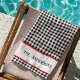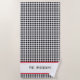 Modern beach towel design features black & white buffalo check pattern with black script name (or text) framed in red and white. Easily change the name-text to make it yours using the Template provided. Awesome personalised gift for newlyweds, graduate, family reunion, pool party hostess, honeymoon gift. Material: front is a polyester blend, back is 100% cotton. Sublimation printing allows for vibrant printing designed to last. Machine washable, tumble dry on low. See "About This Product" at side for more information.