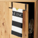 Kitchen towels with a stylish gold heart print on a black and white striped pattern with personalised name print. Matching kitchen decor available.