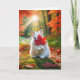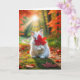 A fluffy white rabbit hiding behind a vibrant red maple leaf against the backdrop of a sunlit forest path