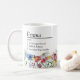 Wildflower mug with custom name definition. The personalisation template is ready for you to add your name and your chosen definition, listing 3 personal attributes, characteristics or skills which could be true, funny, good or bad. The design features watercolor country wild flowers including poppy, daisy, cornflower, coneflower and clover. It is lettered with casual modern script and classic typography. Feel free to change the font or background colour to suit (click "edit using design tool").