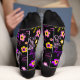 Cute girls socks featuring graphic flowers and your own short name, currently reads Emily printed all over them. A pretty decorative pink yellow purple and white name text and graphic flower pattern on a black background colour which can be changed if required. Ideal for personalising your socks to avoid mix ups. If you require other name lengths please contact me. © Original graphic art and design by Sarah Trett. www.sarahtrett.com for www.mylittleeden.com