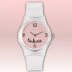 A sporty watch with durable clear silicone buckle strap and pale pink faux glitter face. Name is a bold black script font. Easily change name, replace with monogram initials or remove to make it yours using the Template provided. Choose from other styles and colours.