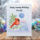 This hand-painted watercolor design features a bright red cardinal perched on a winter branch, holding a snowflake balloon and sitting beside a January birthday cake decorated with white and purple carnations—the traditional flowers for January.