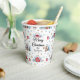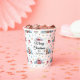 Whimsical "Merry Christmas" script lettering and name featured on this quality made white paper cup with watercolor tea and coffee kettle houses, winter snow trees, tea cup coffee mug, snowflakes and gold stars background. Easily change text and name to make it yours using the Template provided. Dimensions are 3.75"h x 3"d. The cup is 8oz capacity and ideal for cold and warm beverages. 12oz capacity is also available. Add a lid for a small charge. See "About This Product" at side for more information. Printed in USA.
