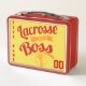 Script design in red and orange tones with the text LACROSSE LIKE A BOSS and a lacrosse stick and ball graphic.