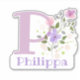 Personalise any item with a Name and Initial with Floral Design Cut-Out Sticker. Example name is Philippa.