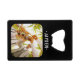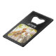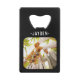 Double sided personalised name and photo credit card bottle opener bar blade with rounded black border.