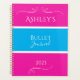 This is a birght, modern, personalised Bullet Journal design in bright and colourful hot pink/ fuchsia, blue and white. On the front it has the text, "Ashley's Bullet Journal 2023" in stylish trending typography. On the back it also says, "Bullet Journal". The text on the front and back is framed by stylish swirl hearts. This elegant design is perfect for a personalised Bullet Journal gift or for a gift for yourself as part of your self-care routine and Bujo journalling. To personalise, simply add your name, in the personalise this text box. Here you can also change the rest of the text if you want to. To change the colour or font, check out the design editing tool. For help with personalisation, matching products, or for a custom design contact me via zazzle chat or email: ursuladawnmoon@gmail.com