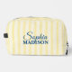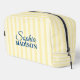 The aesthetic is defined by its classic yellow stripes, evoking the nostalgia of 1950s cabanas and summer styling. The focal point, however, is the custom embroidery or print. Your name is artfully arranged using a playful yet polished combination of flowing script and structured serif fonts, giving it a bespoke, boutique feel. Whether storing makeup, skincare, or travel essentials, this bag ensures you stay organized while looking effortlessly chic.