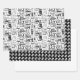 Typography wrapping paper that can be personalised name and age/number. Sheet 1 features a name word cloud in black on a white background. Sheet two is black with a pattern of the number 50 and sheet three is solid white. Make your give extra special with this wrapping paper design.