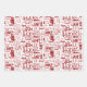 Typography wrapping paper that can be personalised name and age/number. Sheet 1 features a name word cloud in red on a white background.  Sheet two is red with a pattern of the number 50 and sheet three is solid white. Make your give extra special with this wrapping paper design.