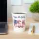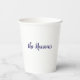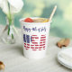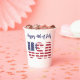 Patriotic USA flag stencil design with 'Happy 4th of July' in stylish navy blue script lettering decorate this festive white paper cup. Easily add name or text on back to make it yours using the Template provided. Choose 8oz or 12oz capacity. Ideal for cold and warm beverages. Add a lid for a small charge. See "About This Product" at side for more information. Made in U.S.A.
